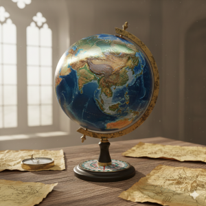 [场景] 古朴胡桃木书桌,表面有天然木纹与岁月磨损痕迹,桌面散落泛黄纸质地图与黄铜罗盘 [主体] 黄铜支架固定深蓝色地球仪(直径30cm),球体正面精准定位东亚区域