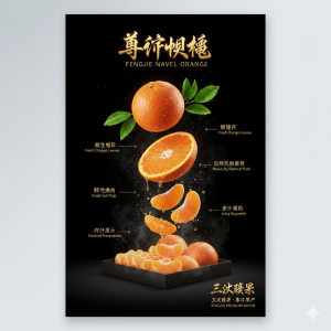 一个优质的中国地理标志水果食品海报。在纯黑背景(#000000)上,奉节脐橙以解构式悬浮实体层级呈现,展现其新鲜、多汁、自然成熟的高端形象。