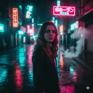 充满电影感的夜间人物肖像画,营造出一种超现实、梦幻般的氛围