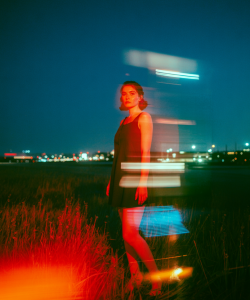 这是一幅充满电影感的夜间肖像画,营造出一种超现实、梦幻般的氛围。一位女子站在一片高高的草丛中,在一束鲜艳的红橙色聚光灯的照射下,她的身影格外明亮,与深邃的青蓝色天空形成了鲜明的对比。