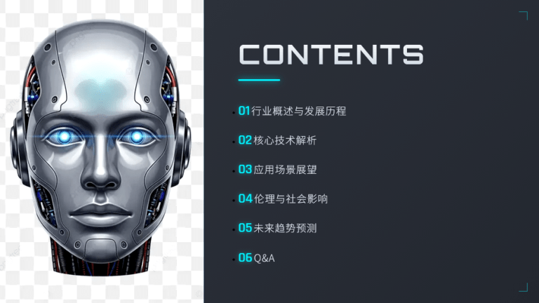 一张面向未来的科技感PPT目录PPT目录页,采用左右分栏布局。