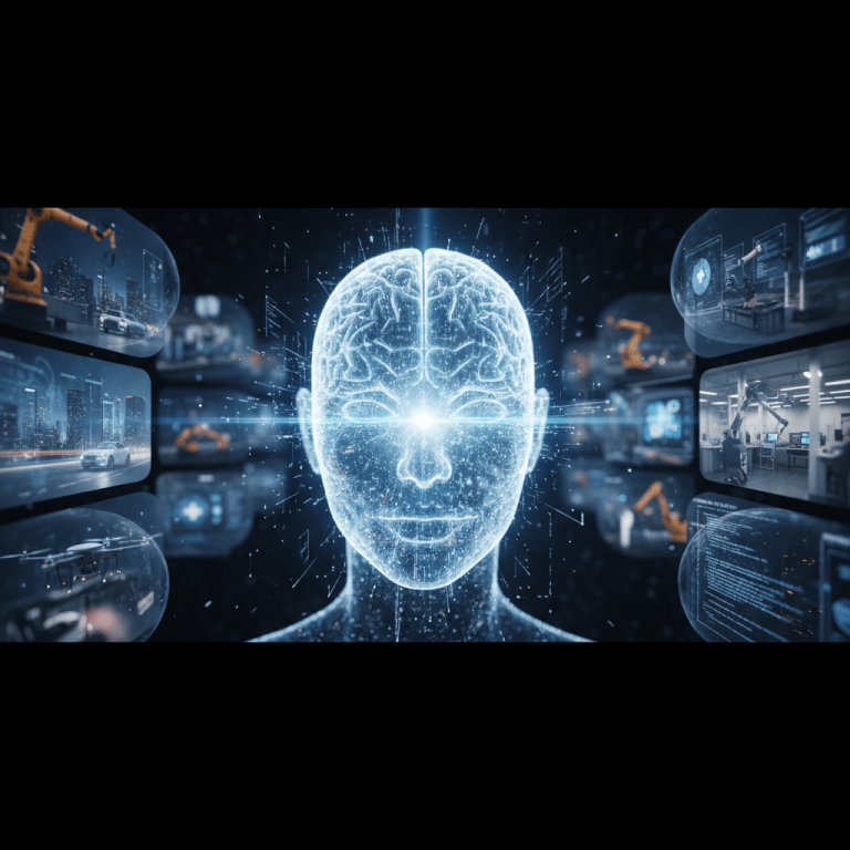 一张电影级宽幅科技Banner图(比例21:9),超写实,全景深效果。画面中央,一个由发光粒子与流动数据构成的全息AI大脑模型(或抽象的人脸轮廓)静静悬浮,散发着柔和的蓝色与白色光芒,极具未来感与智慧感。背景则是经过艺术化景深虚化处理的、代表人工智能应用的多个微型场景:如自动驾驶汽车穿行于城市光影、机械臂在工厂精准装配、医疗影像分析界面、无人机集群飞行、代码流在深空背景中滚动。这些场景色彩丰富但被柔焦处理,如梦幻泡影般环绕中心主体,突出而不杂乱。整体色调以科技蓝、银白与深空黑为主,光线汇聚于中央AI符号,营造出引领未来、赋能万物的宏大氛围。