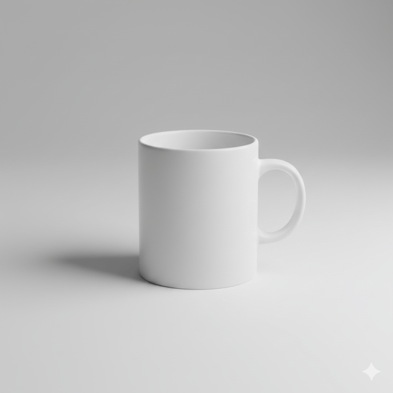 一个纯白色的陶瓷马克杯,放置在光滑的浅灰色背板上。柔和的前上方光源产生细腻的阴影,展现出完美的椭圆形杯口和优雅的弧形手柄。哑光质感,极度干净的画面,单色美学。工作室摄影风格,OC渲染器渲染器,超高细节,商业级质量。
