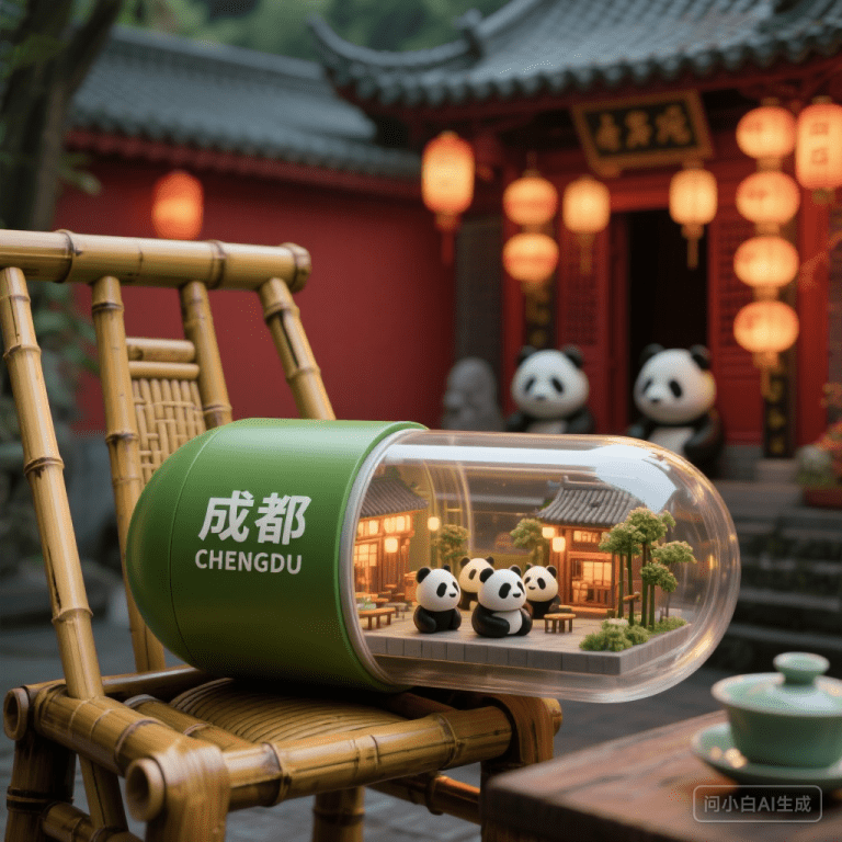 一个胶囊,胶囊左半部分为竹绿上面印着 “成都 CHENGDU”,右半部分是透明材质成都武侯祠、锦里古街、熊猫雕塑组成的 3d 微缩景观在胶囊之中,胶囊被横放在茶馆的竹椅旁。