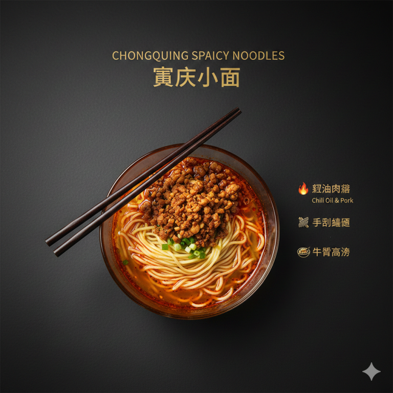 极简主义顶视角美食海报,纯黑磨砂背景凸显层次。画面中心为透明玻璃碗盛装重庆小面:① 顶层红亮辣椒油与焦香肉末 ② 中层金黄碱水面条 ③ 底层琥珀色高汤,碗沿斜靠乌木长筷。 海报顶部居中排印无衬线字体:英文「CHONGQING SPICY NOODLES」/中文「重庆小面」烫金字样。碗侧垂直排列分层说明: 🔥 红油肉臊(Chili Oil & Pork) 🍜 手工碱面(Alkaline Noodles) 🍲 牛骨高汤(Beef Bone Broth) 柔光摄影突出油光质感,碗底投射浅灰色阴影,8K画质呈现葱花与花生碎细节,商业级美食海报设计