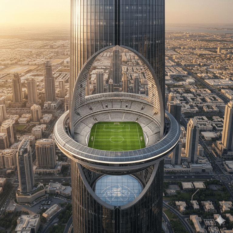 城市中央,迪拜超高层锥形摩天大楼(命名为“迪拜顶点塔”,致敬哈利法塔的几何美学),中部镂空层嵌入全开放环形天空足球体育场——环形看台采用浅灰色金属格栅。要求细节逼真,符合建筑工程美学。
