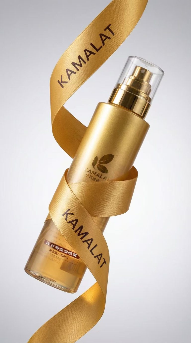 瓶子上缠绕着一条[宽金缎带](宽 10 厘米,有光泽),从瓶底螺旋缠绕至泵头,上面印有重复的黑色“KAMALAT”字样。缎带自然褶皱,略有轻微的皱纹,增添了动态的纹理。