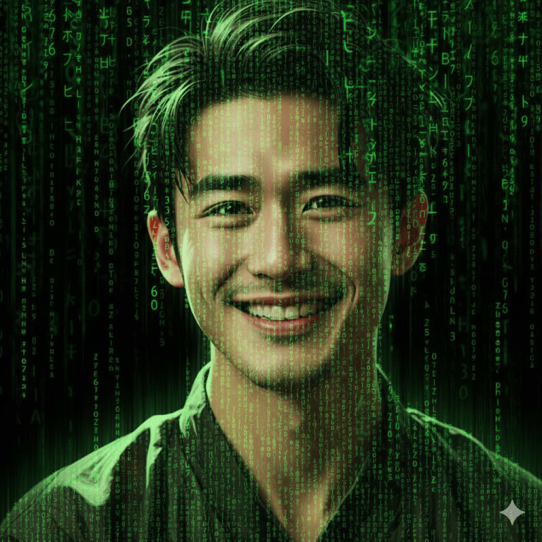 第二步:输入提示词——将这张图像转化为数字《黑客帝国》风格场景。背景和主题应由倾泻而下的霓虹绿色代码组成,在黑色背景下,类似于标志性的《黑客帝国》数字雨。使用发光的绿色符号(英文假名、数字和拉丁字母),带有一些运动模糊和深度。添加微妙的光照效果来模拟屏幕辉光,增强赛博朋克、高科技氛围。