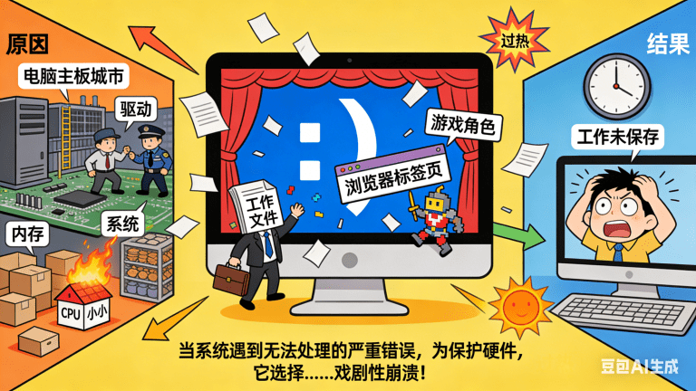 - 右侧(结果区):电脑前,一个卡通人物目瞪口呆、抱头抓狂,背景是时钟(表示工作未保存)。画面色彩鲜艳,用箭头和爆炸图标动态连接各部分,底部配文:“当系统遇到无法处理的严重错误,为保护硬件,它选择……戏剧性崩溃!”