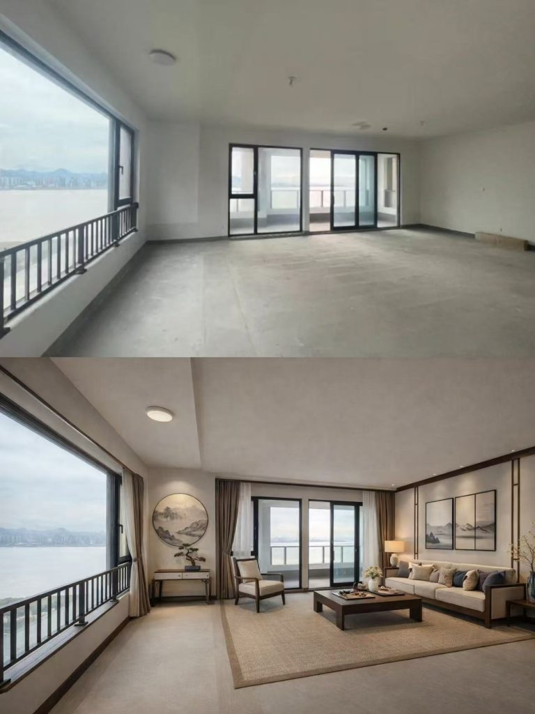 将上传的室内客厅图改造成简约新中式风格的精装修房间。保留原有的空间布局和自然采光。增加:右边为浅灰色乳胶漆墙面搭配木质护墙板,浅米色仿木纹地板,米色布艺沙发配深色抱枕,深色木质咖啡桌,一把藤编单椅,左边墙上一幅圆形山水画,右边墙上三幅山水画,双层窗帘(浅棕色亚麻布+白色纱帘),嵌入式天花板灯+圆形主灯+落地灯,边桌上摆放小型盆栽,沙发旁放一个插着花的陶瓷花瓶。整体氛围温馨、优雅,与室外的河景相得益彰。