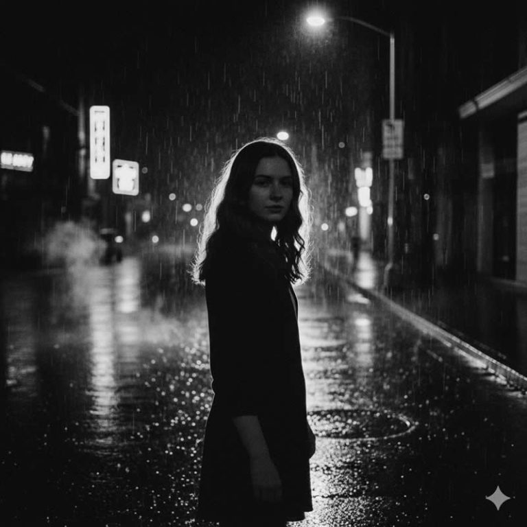 这是一幅极具真实感的电影式肖像画,采用强烈的高对比度黑白光影效果。人物站在凌晨三点时湿漉漉、阴雨连绵的城市街道上。具有电影派风格的色调,阴沉的阴影,厚重的胶片颗粒,使用 50 毫米镜头拍摄。低光照明,仅一盏路灯形成强烈的边缘光。