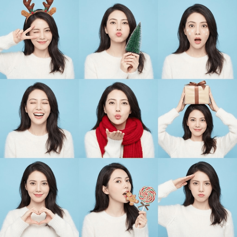 造型:她身穿一件柔软的白色马海毛毛衣。配饰在不同画面中略有变化:驯鹿角发箍、厚厚的红色针织围巾,以及手中巨大的圣诞棒棒糖。姿势:1. 眨眼并比出V字手势。2. 嘟嘴,手里拿着一棵迷你圣诞树。3. 惊讶的表情,脸颊上贴着雪花贴纸。4. 闭眼大笑。5. 飞吻。6. 头顶着一个包装好的礼盒。7. 用手比出心形。8. 假装吃姜饼人。9. 敬礼,表情严肃可爱。背景:所有画面均使用统一的浅蓝色摄影棚背景。灯光:明亮、无阴影的柔和灯光,高调,商业流行风格。