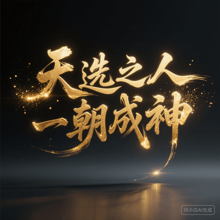 暗黑色调背景下,金色毛笔字体“天选之人,一朝成神”。运用简洁大气的毛笔字体,书法字体,狂草,笔锋刚劲,线条奔放,节奏跳跃,气势磅礴,整体简洁明了,无过多装饰,塑造企业专业形象,适用于商务合作、项目报告等场景。