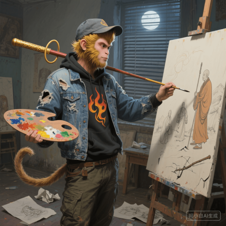 孙悟空(现代版)身穿破洞牛仔夹克与火焰纹样卫衣,头戴鸭舌帽(帽檐下露出金色猴毛),金箍棒化作铅笔插在耳后,尾巴随意缠在腰间工装裤上。站在复古画室中,他左手托调色板(颜料泼溅如筋斗云),右手执画笔悬停在画布前,表情凝重。窗外月光透过百叶窗,在他毛茸茸的侧脸投下斑驳光影,脚下散落揉皱的素描稿(画着破碎袈裟、断裂禅杖)。画布上隐约显示着他们师徒路上取经的画面。