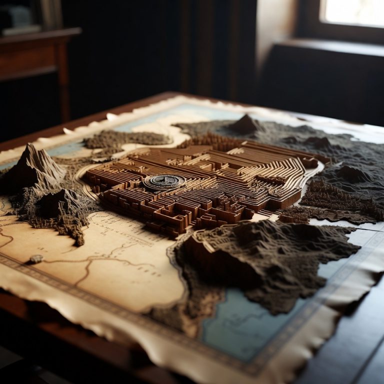 一张电影般的照片,展示了一幅古老的地图放在屋内桌面上,地图上显示着一座迷宫的三维景观。