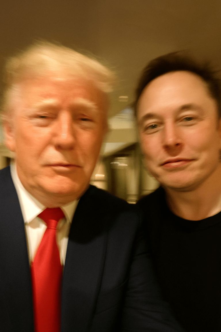 请生成一张极其平凡无奇的 iPhone 自拍照,没有明确的主体或构图感,就像是随手一拍的快照。照片略带运动模糊,阳光或店内灯光不均导致轻微曝光过度。角度尴尬、构图混乱,整体呈现出一种刻意的平庸感-就像是从口袋里拿手机时不小心拍到的一张自拍。时间是晚上。照片主角是「特朗普」,旁边是「马斯克」。