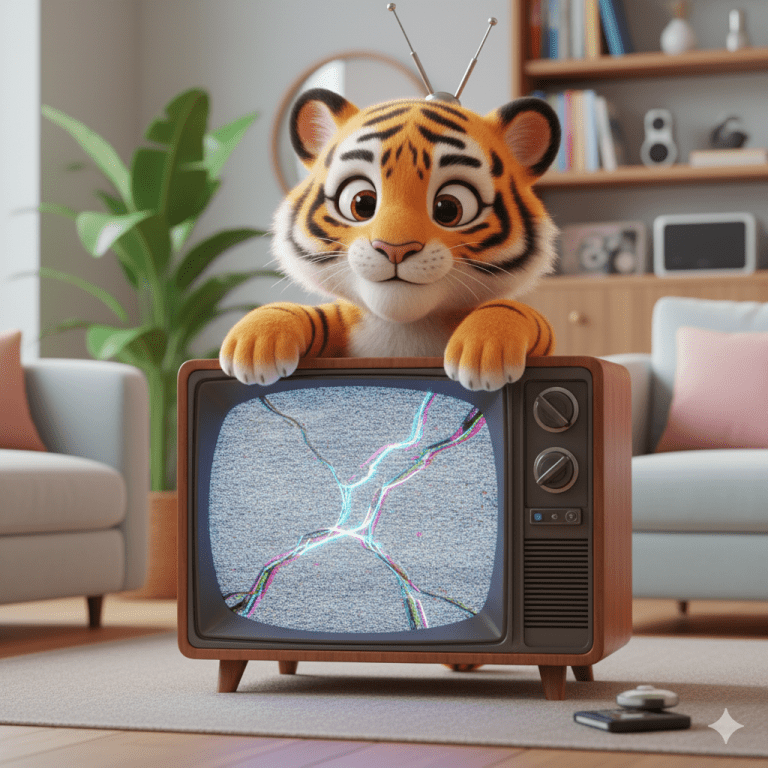 卡通风格,一只可爱又调皮的老虎从一个老式电视机屏幕里探出半个身子,爪子搭在电视框上,电视屏幕上布满了雪花点和故障效果的裂纹。老虎一脸好奇地看着外面,背景是一个舒适的现代客厅。色彩鲜艳,线条流畅,3D渲染,光效柔和。