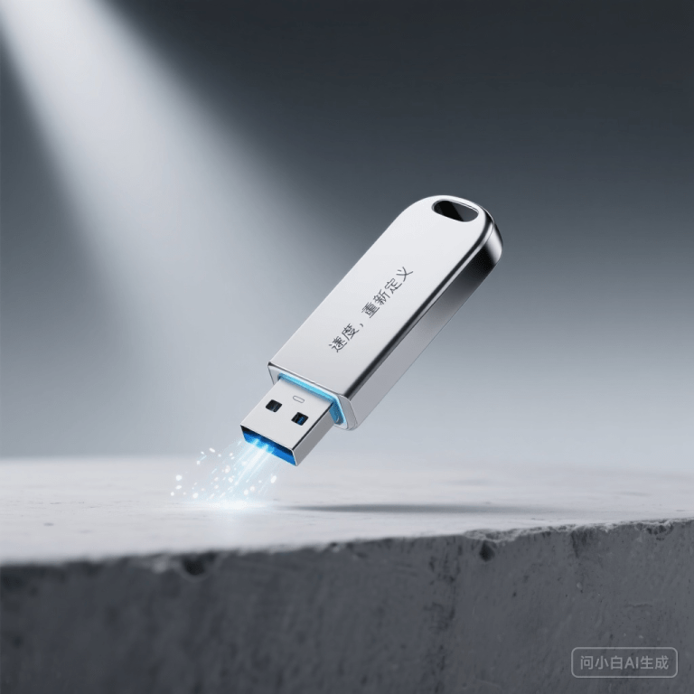 一张极简风格的U盘产品海报。流线型的金属U盘悬浮在干净的软渐变混凝土背景前。戏剧性的影棚灯光在其表面形成锐利的反射,凸显其精密工艺的边缘。动态的光粒子正流入USB接口,象征着数据传输。其旁是优雅的现代版式文案“速度,重新定义”。构图平衡且专业,使用OC渲染器,8K分辨率,超现实主义细节。配色:石板灰、银色和电光蓝点缀。