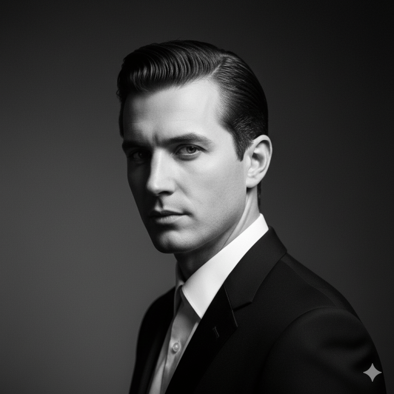 A black and white portrait in the iconic Studio Harcourt style. A [elegant woman / man] with [perfectly styled hair / specific hairstyle e.g., slicked-back], facing three-quarters towards a dramatic light source. Chiaroscuro lighting creating strong contrasts between deep, velvety shadows and brilliant highlights that sculpt the facial features. A subtle subtle, soft-focus glow envelops the subject, smoothing skin texture while retaining character. The background is a simple, textured dark gray. The subject exudes an aura of timeless elegance and quiet confidence, dressed in a classic [black turtleneck / tailored suit / evening gown]. Shot on a medium format camera, high grain silver gelatin print, masterpiece of portrait photography.