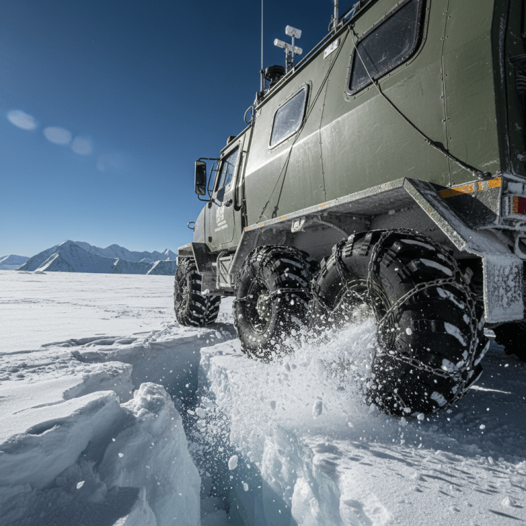 一辆橄榄绿色的六轮驱动极地探险车,车身布满科学仪器天线和防滑链,正缓慢穿越珠穆朗玛峰海拔8800米处的“希拉里台阶”下方冰原。暴风雪刚过,天空呈现诡异的澄净碧蓝,阳光在新鲜雪面上反射出刺眼的光芒。车辆右侧轮胎陷入冰缝,溅起的冰渣在阳光下如钻石飞舞。视角是从侧后方近距离平视,强调车辆的巨大轮胎与脆弱环境的对比。风格为超高清摄影,焦点在轮胎溅起的冰晶和车身上的结霜纹理,背景是无比清晰的喜马拉雅群峰。氛围是混合着惊人美景的极致危险与孤独。