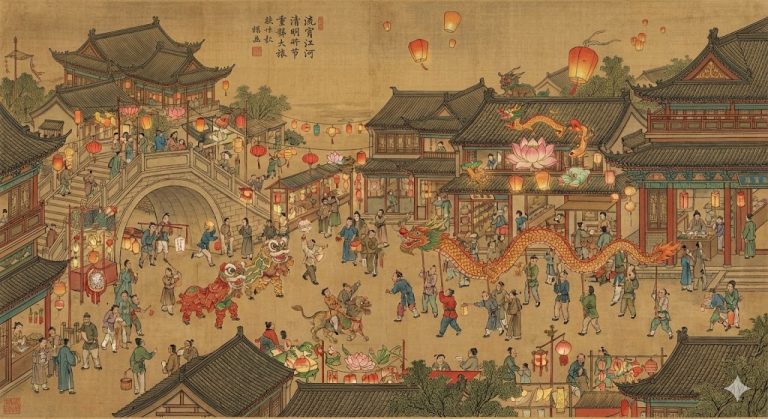 AI生成一幅中国元宵节街市热闹图景,参考清明上河图风格