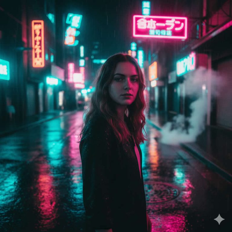 一幅充满质感、被霓虹光笼罩的赛博朋克风格人物画作