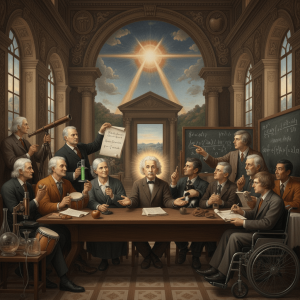 一群物理学家坐在一起 模仿达·芬奇《最后的晚餐》构图