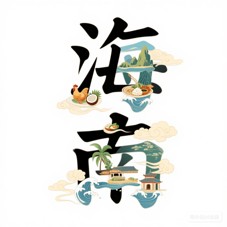 中国风非遗创意字体设计,插画海报,白色背景,文字“海南”,“海”字内笔画嵌入文昌鸡、海南粉、椰子饭等当地小吃,辅以飘逸云纹与海浪图案。“南”字内笔画嵌入天涯海角、五指山、亚龙湾等特色建筑,整体充满海南的热带风情与文化底蕴。